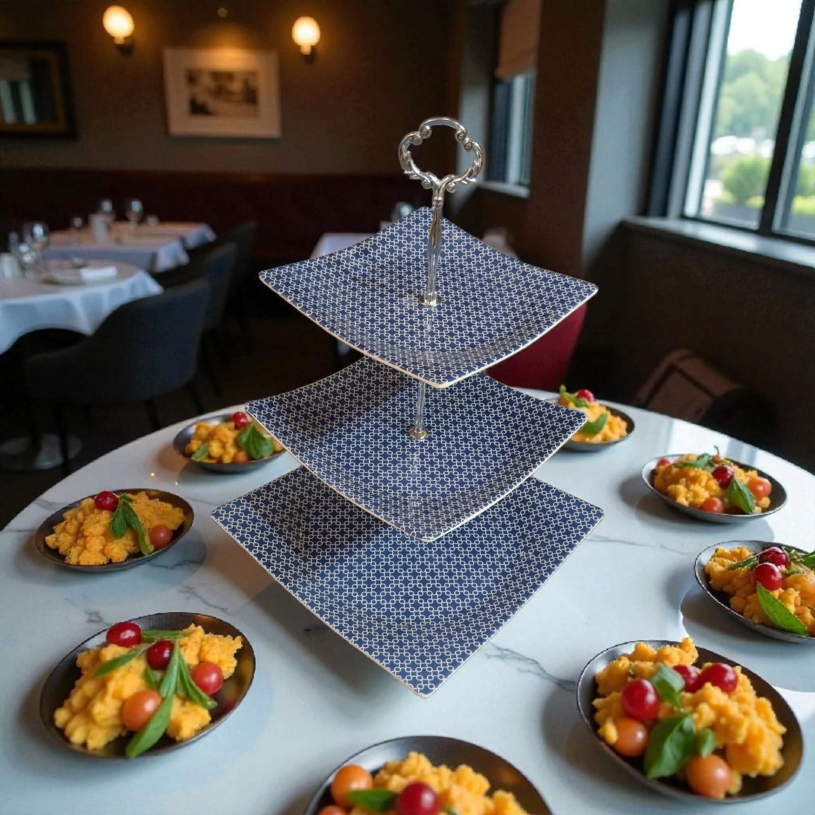 Serve your desserts in style with this 3-layer melamine dessert stand from CLARIFY.PK. Featuring a stunning blue mosaic pattern, it’s perfect for cupcakes, sweets, snacks, and party treats. Lightweight, durable, and break-resistant, this stand adds elegance to tea tables, events, and celebrations. Easy to assemble, easy to clean, and reusable for every occasion.