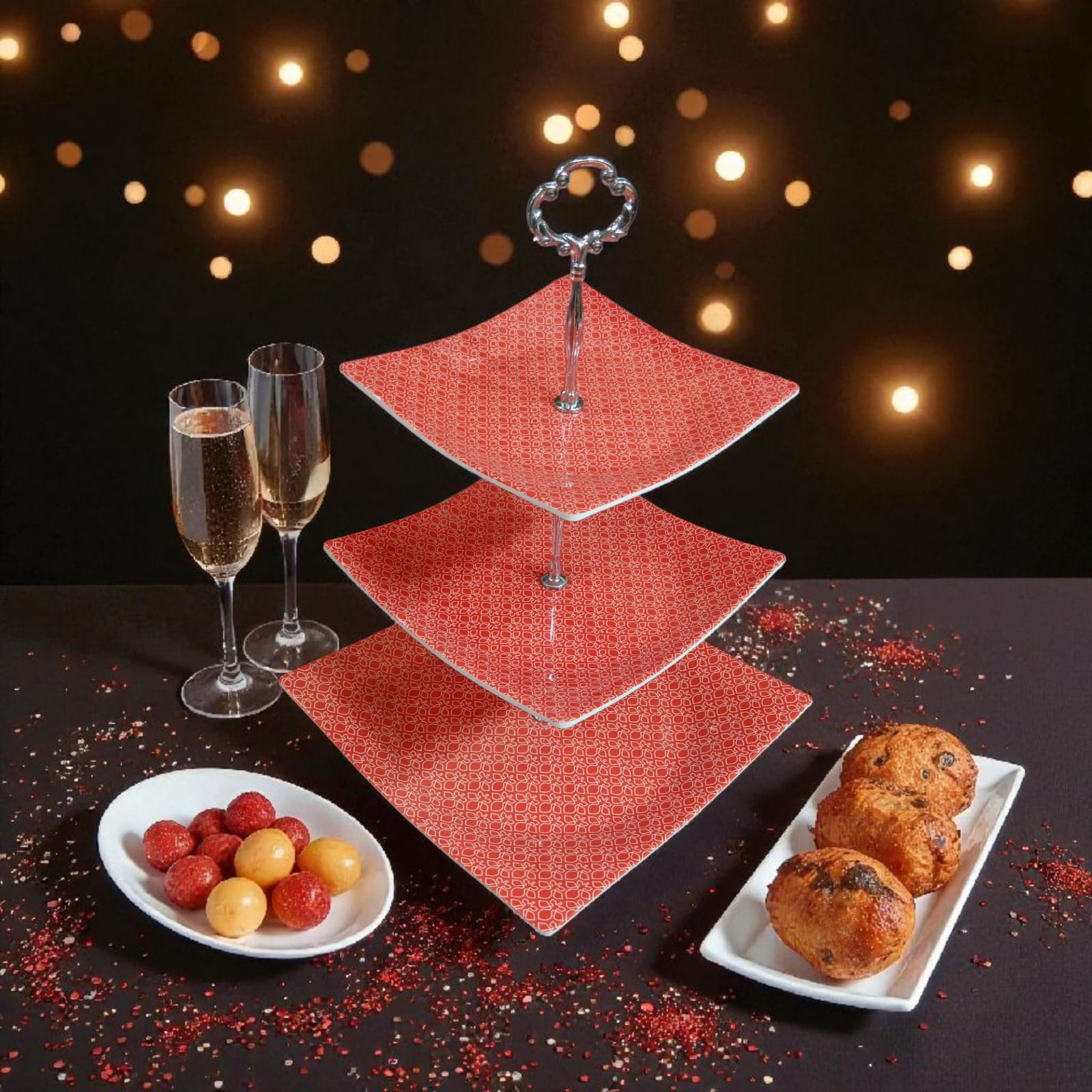 Showcase your desserts with elegance using this 3-tier cupcake stand from CLARIFY.PK. Designed with a luxurious red mosaic pattern, it’s perfect for displaying cupcakes, pastries, snacks, and party treats. Made from premium melamine, it is lightweight, durable, and break-resistant. Easy to assemble and clean, this stand adds a refined touch to any event, tea party, or celebration.