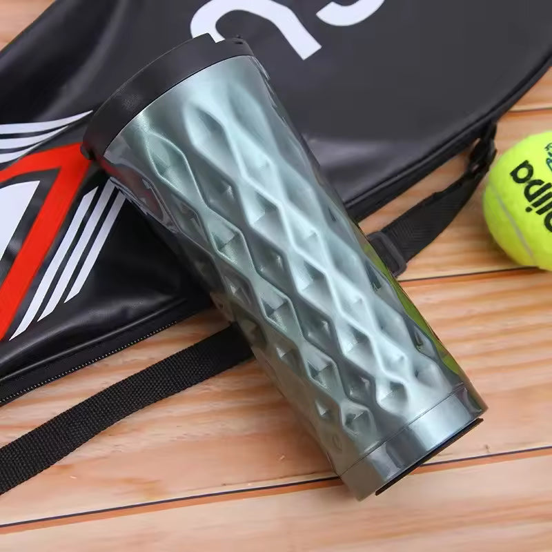 The 500ml insulated travel mug fits easily in your car cup holder or bag. The sleek design features a patterned stainless steel exterior. It resists stains and odors. The leak-proof lid helps prevent spills. Use it in the office, gym, or at home.