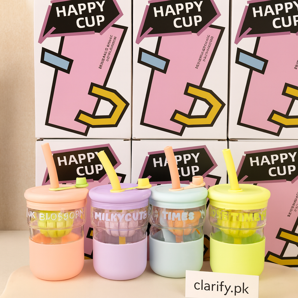 Sip in style with this Happy Glass Cup, featuring a colorful lid with straw and cute flower design. Made from durable glass with a secure lid, it’s perfect for water, juice, smoothies, or iced coffee. The portable size makes it easy to carry for school, office, gym, or travel, while the fun and aesthetic design brightens your daily routine. A must-have drinkware piece that’s both practical and adorable.