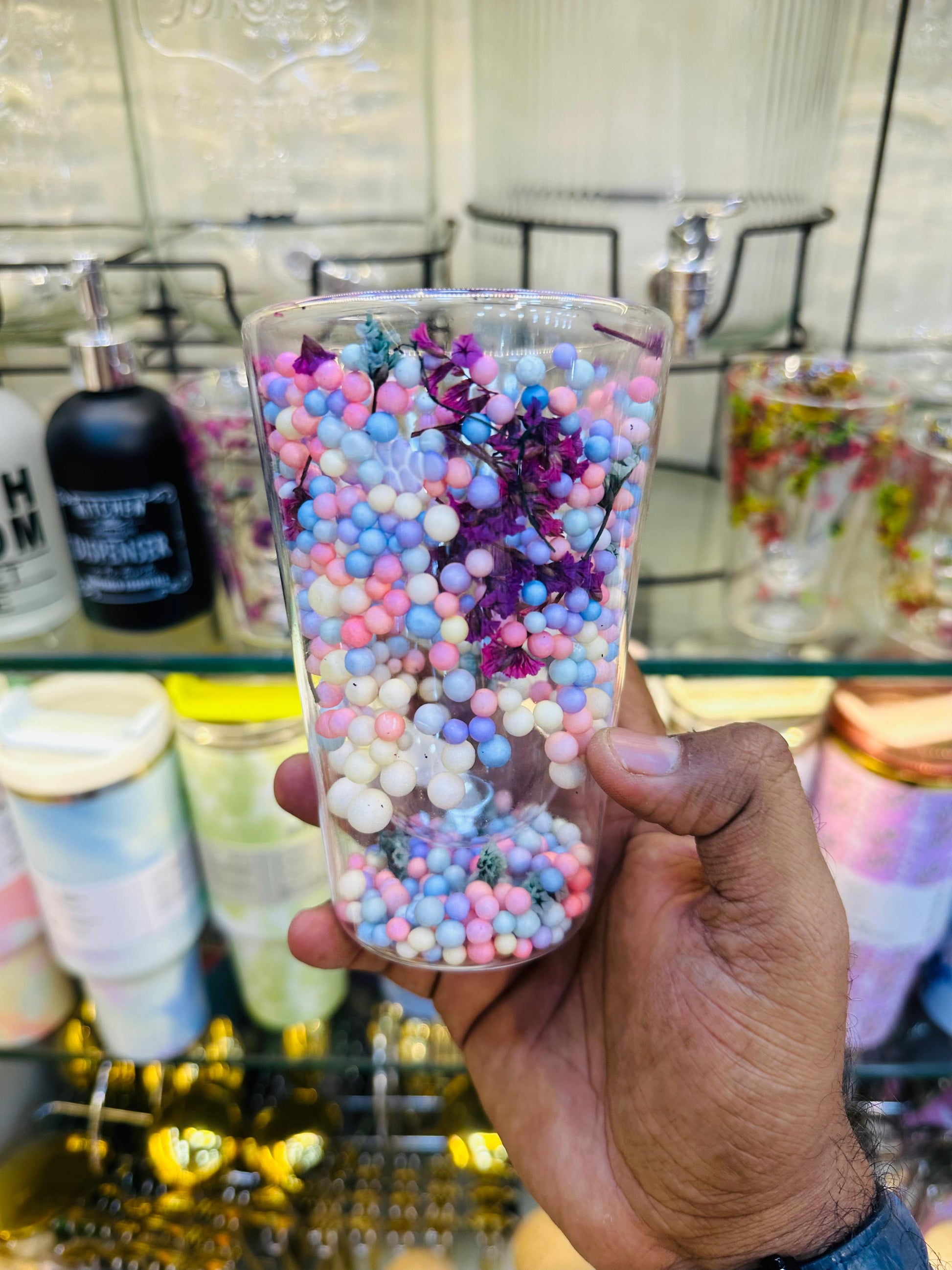 Bring a soft, aesthetic charm to your space with this Pastel Bloom Double Wall Glass Cup. The inner wall features delicate dried flowers and pastel decorative beads, giving it a dreamy, elegant look perfect for shelf display, décor setups, photography props, and gifting.