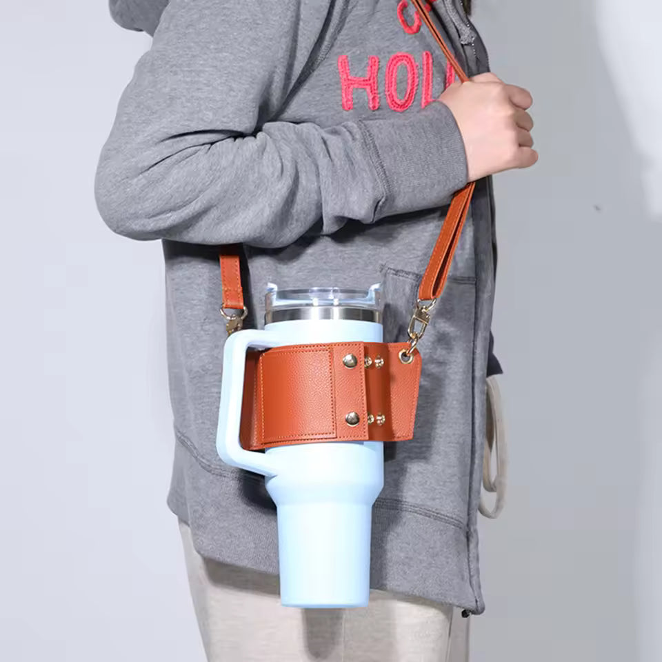 Carry your drink in style with this water tumbler holder with adjustable strap. Designed for 40oz bottles, this PU leather pouch offers durability, comfort, and hands-free convenience. Perfect for travel, gym, hiking, or daily use, it keeps your tumbler secure while adding a modern look. The adjustable strap makes it easy to wear across the body or on the shoulder, making hydration stylish and effortless.